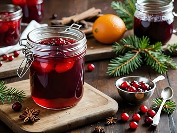 Winter spiced cranberry jelly made with fresh cranberries, red wine, star anise, cinnamon, water, butter, sugar, cloves, nutmeg, orange peel and pectin